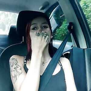 Mature woman rubs her pussy and masturbates in the car in traffic and has an orgasm