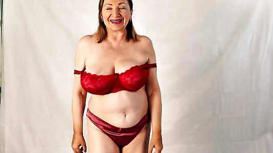 Busty swallow internal cumshot as Lady in Red - Hot Mature Striptease