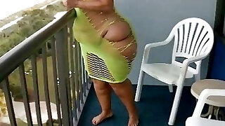 Fluffy grandma of my wife puts on swimming suit in beach cabin