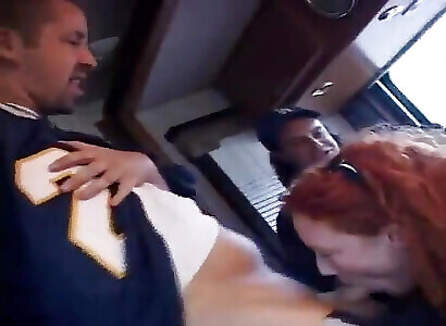 Hot redhead slut Audrey Hollander is sucking and fucking cocks on the bang bus