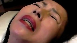 Buxom and naughty Oriental mom in stockings fucks herself wit