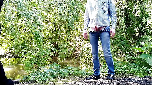 Mother-in-law receives golden shower in the park on her bare legs
