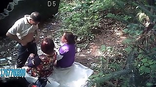 Old Stud And 2 Asian Prostitutes Outdoors
